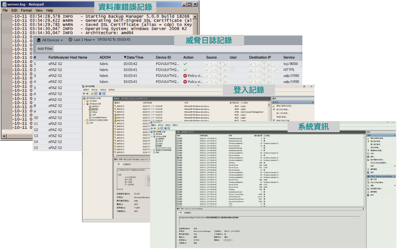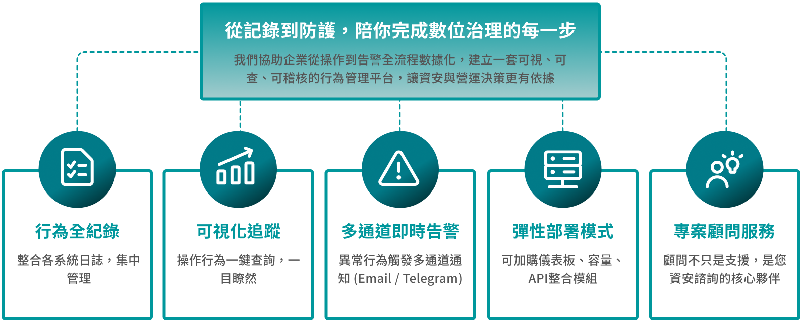 涵蓋系統日誌集中管理、操作軌跡可視化、異常行為即時通報、模組化擴充部署與顧問支援服務,強化企業對內部操作與異常風險的掌握力。